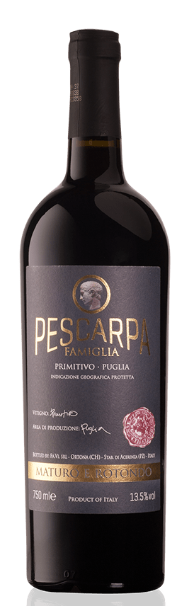 Pescarpa Primitivo er skabt på den populære Primitivo‑drue, som i Californien er kendt under navnet Zinfandel. Vinen kommer fra Puglia – hælen af Italien – hvor klimaet og jordbundsforholdene giver druen optimale betingelser.
